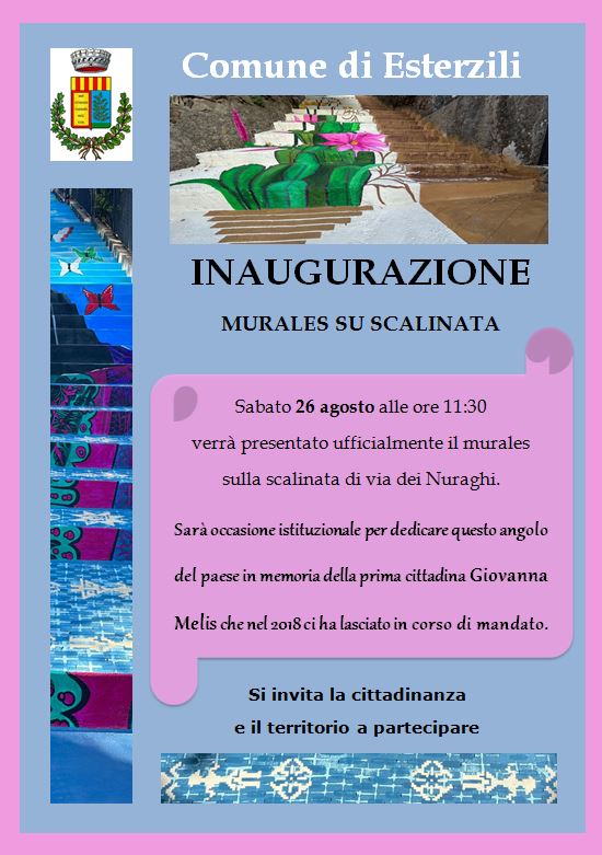 Si invita la cittadinanza e il territorio a partecipare alla presentazione del murales sulla scalinata di Via dei Nuraghi che si terrà Sabato 26 agosto alle ore 11:00.